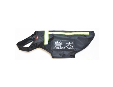 牛津布材质,身体两侧配有刺绣警犬字标,并可更换为其他字样。后背配有反光条,夜间巡逻清晰醒目。